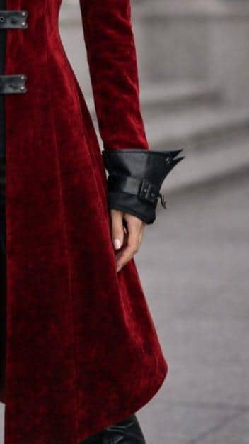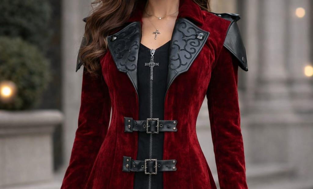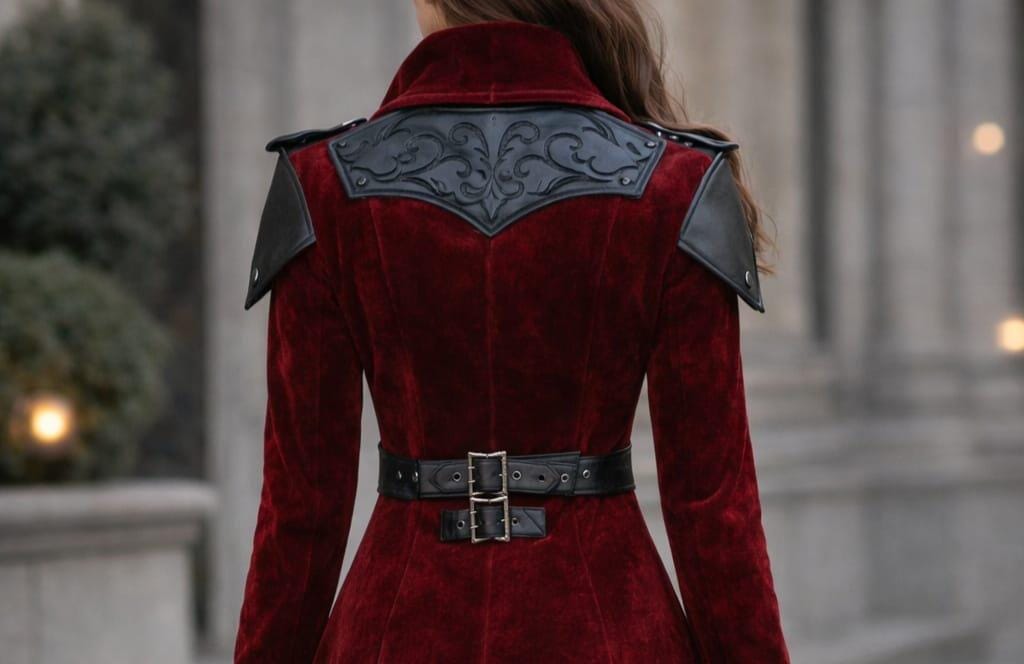 Step into dark elegance with this stunning Gothic Red Velvet Long Coat, designed for bold, confident women who love Victorian, medieval, and steampunk fashion. Crafted from premium velvet fabric, this coat features intricate black leather detailing on the collar, shoulders, and cuffs, giving it a dramatic and powerful silhouette.