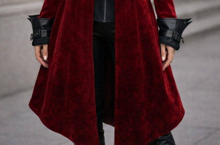 Gothic Red Velvet Coat for Women – Victorian Long Trench Coat with Black Leather Details – Medieval Vampire coat – Winter Steampunk Gothic Outerwear