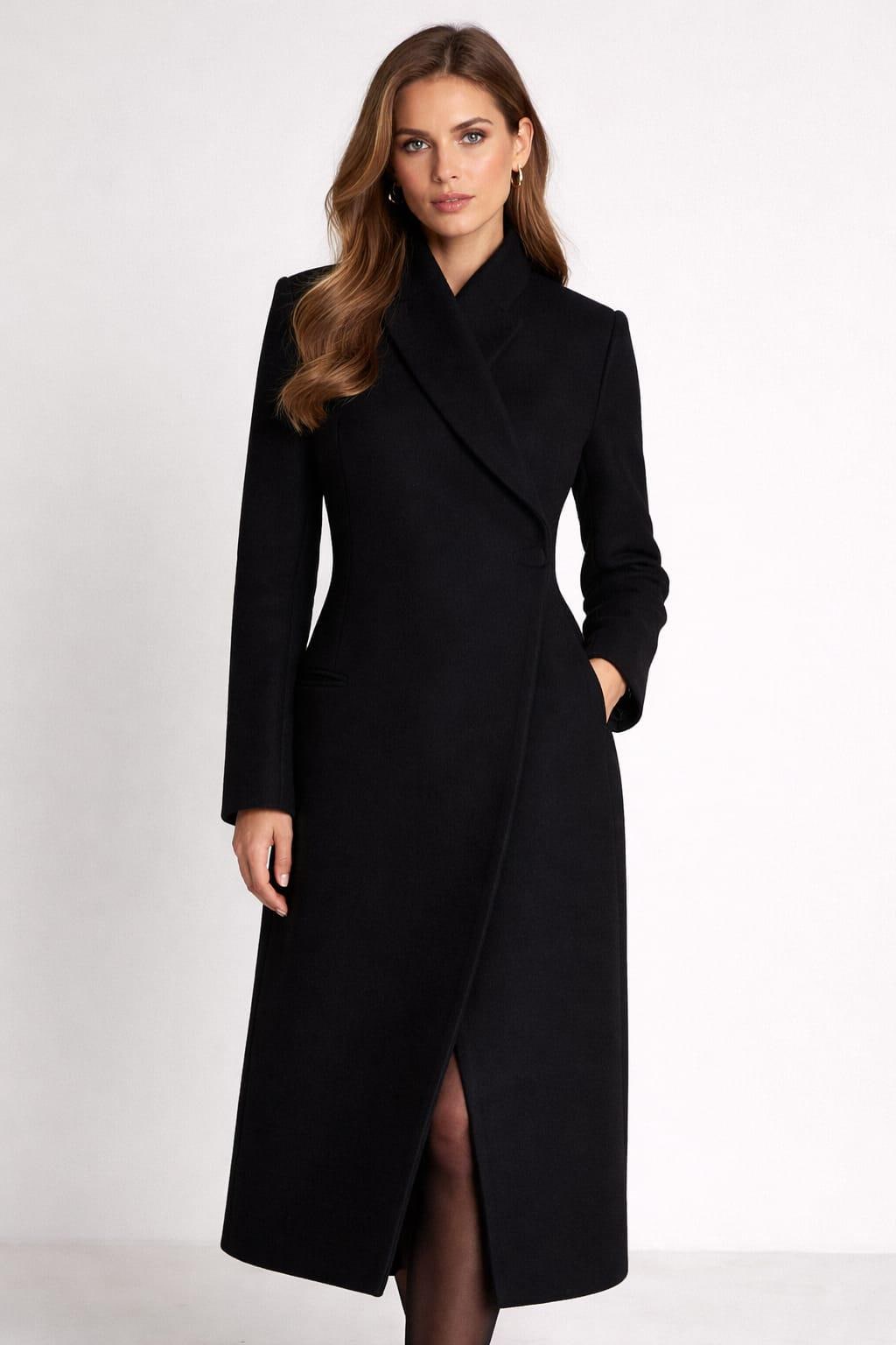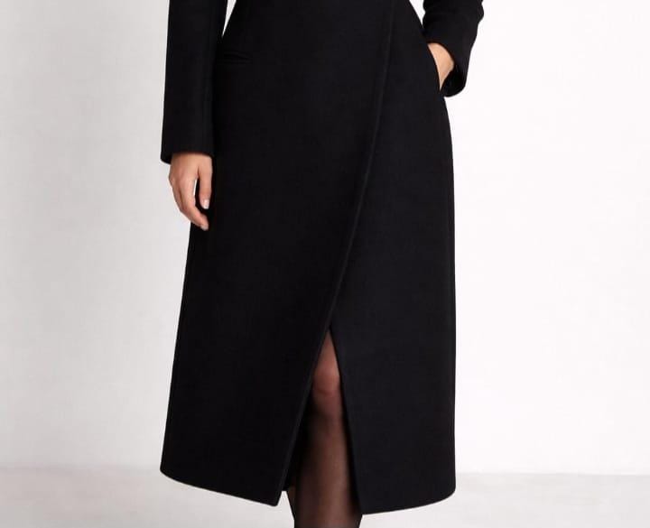 Turn heads with this elegant black wrap coat dress, designed for modern women who love timeless, minimalist fashion. This tailored midi coat dress features a flattering wrap silhouette, structured lapel collar, long sleeves, and a subtle front slit for effortless sophistication.