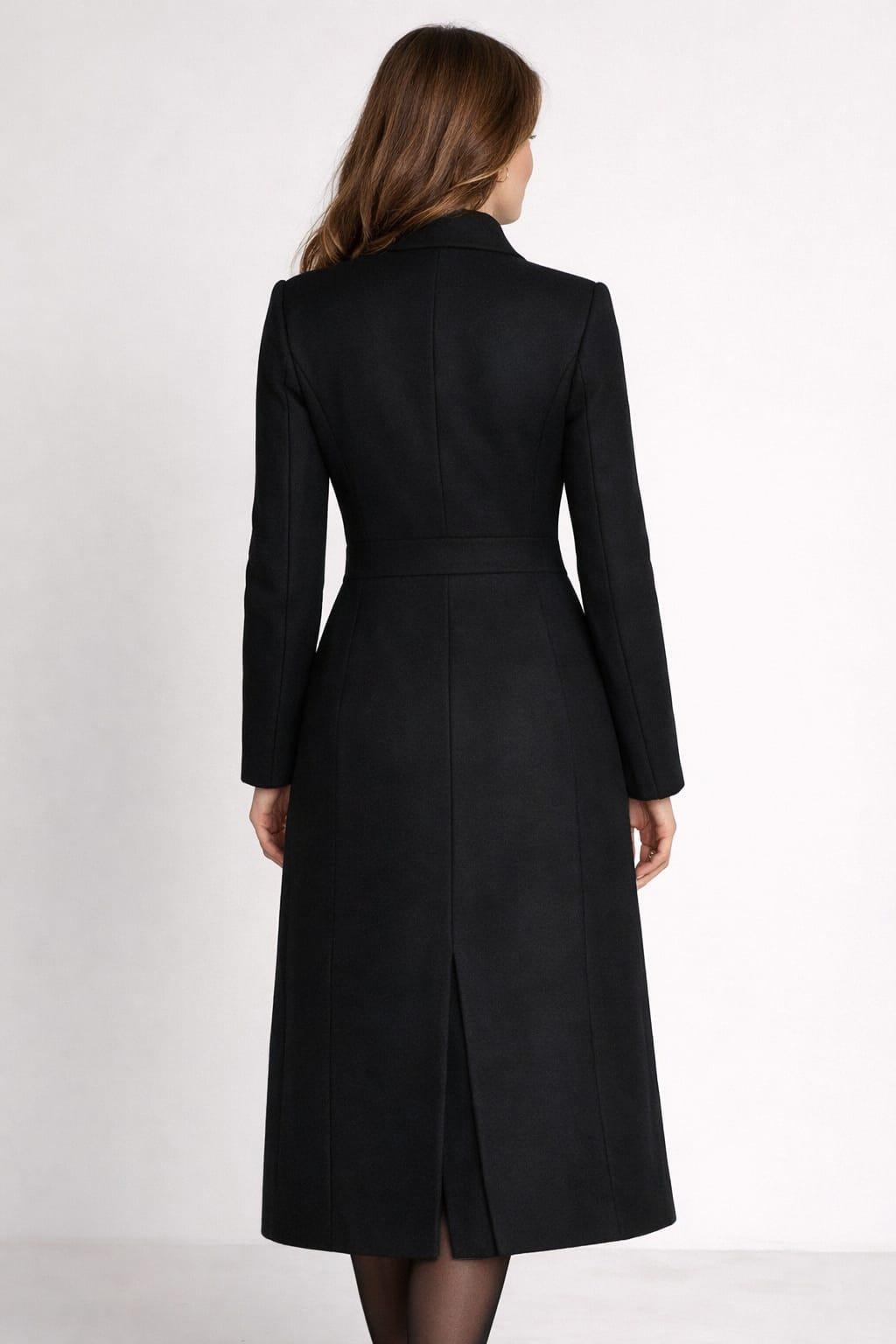 Black Wrap Coat Dress, Elegant Midi, Minimalist Formal Winter Style