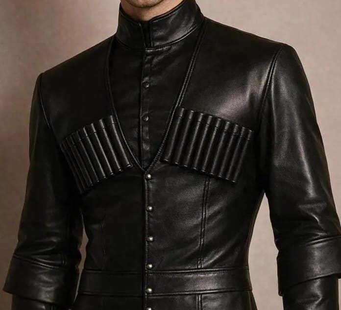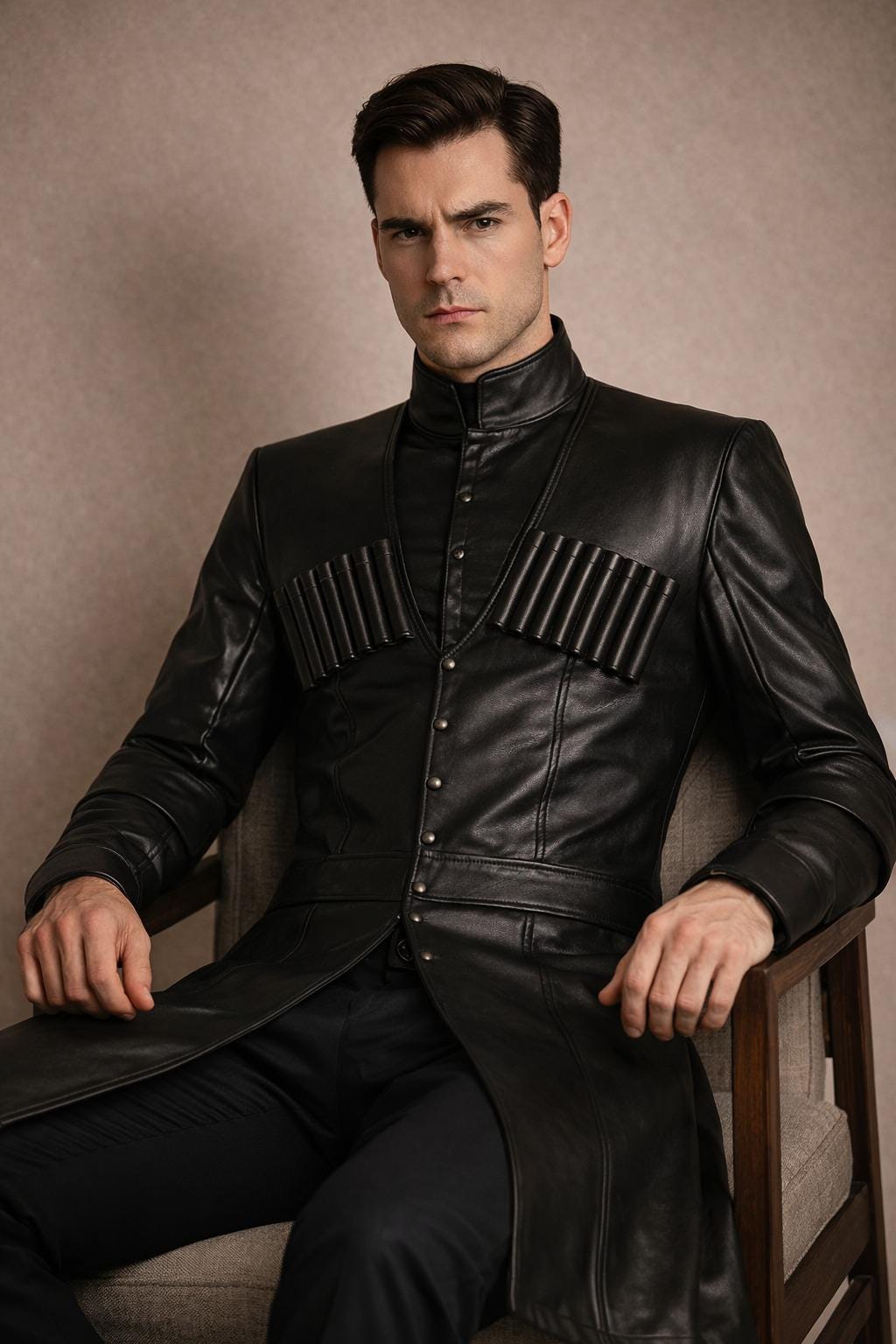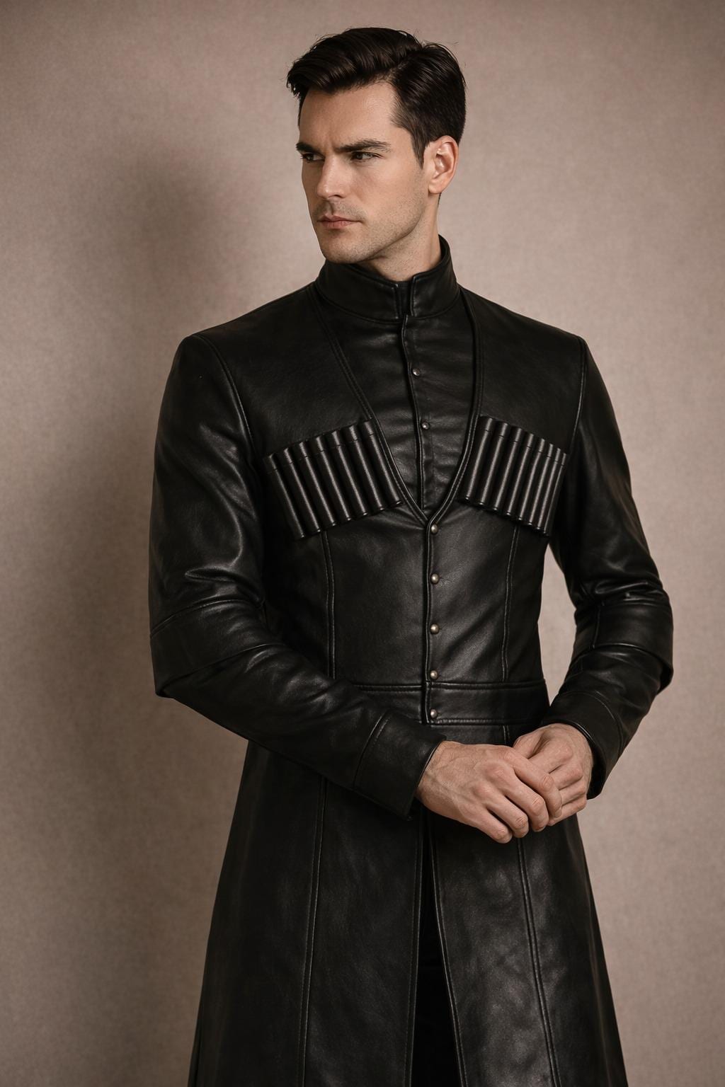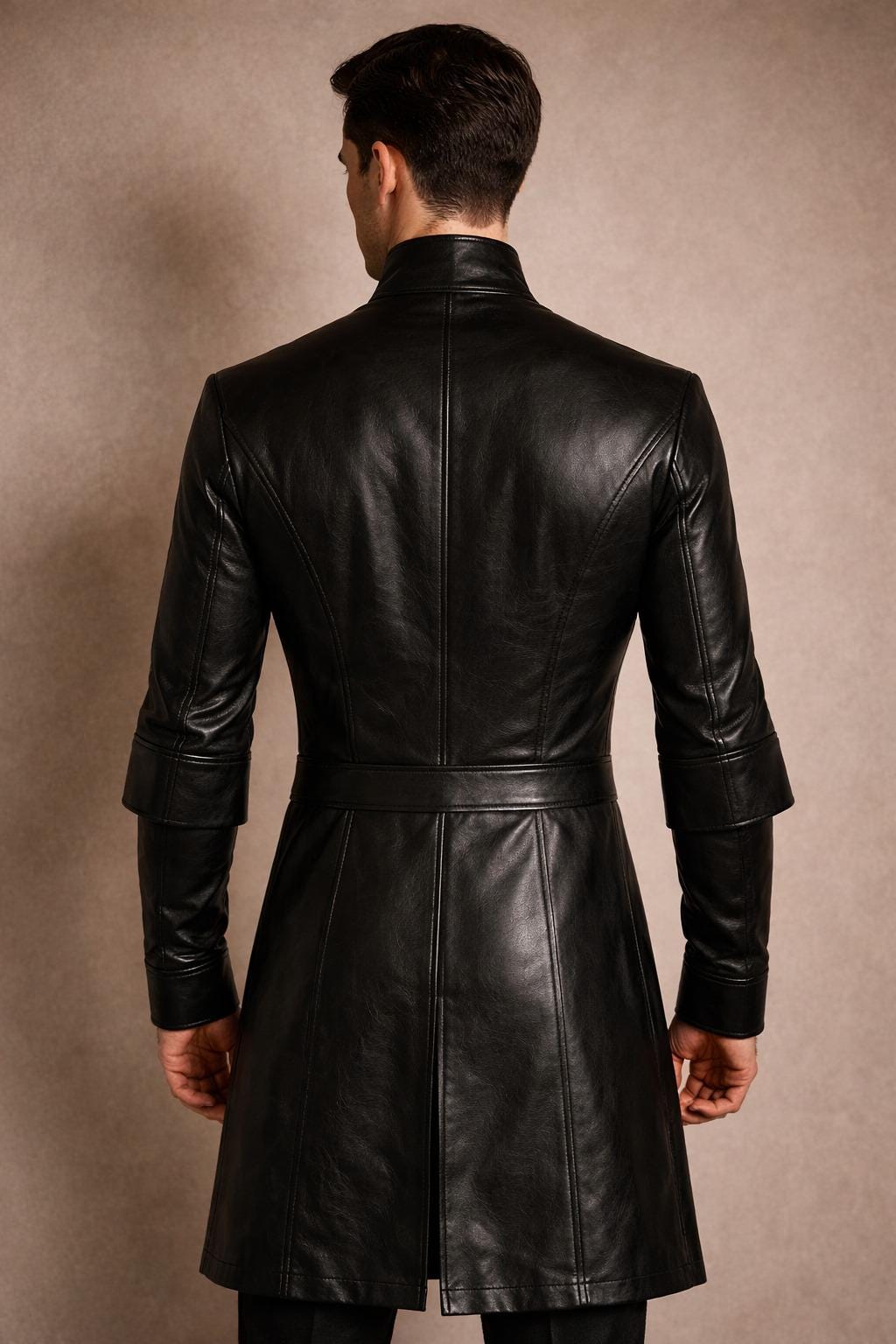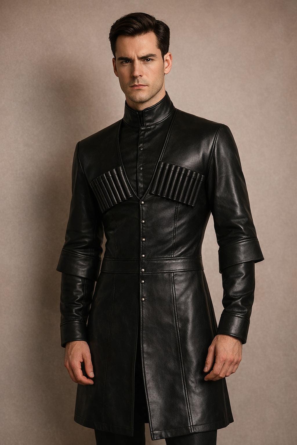 Step into bold elegance with this Men’s Black Leather Long Coat, designed for those who love gothic, military, and futuristic fashion. Crafted with premium-quality leather, this statement trench coat features a structured fit, front button closure, high collar, and unique chest detailing inspired by steampunk and cyberpunk aesthetics.
