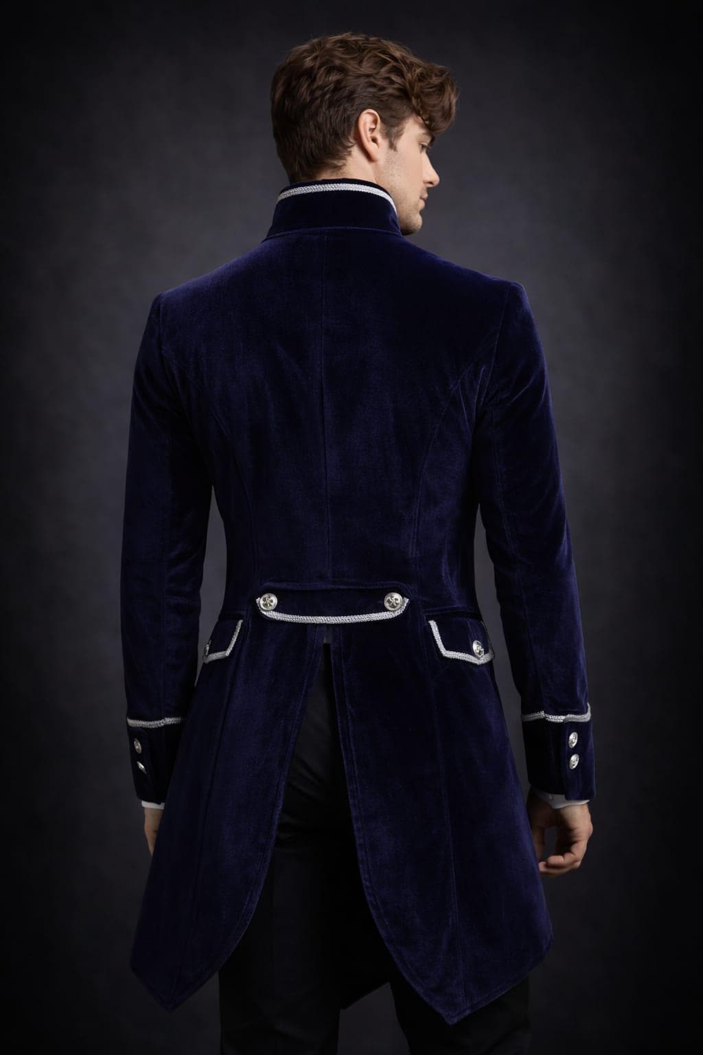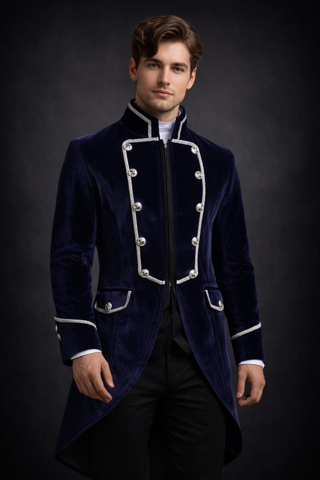 Step into timeless elegance with this luxurious Victorian inspired velvet tailcoat, designed for men who appreciate classic historical fashion and royal style. This navy blue velvet coat features a sophisticated military-inspired design with decorative silver buttons and braided trim, giving it a regal and aristocratic look.