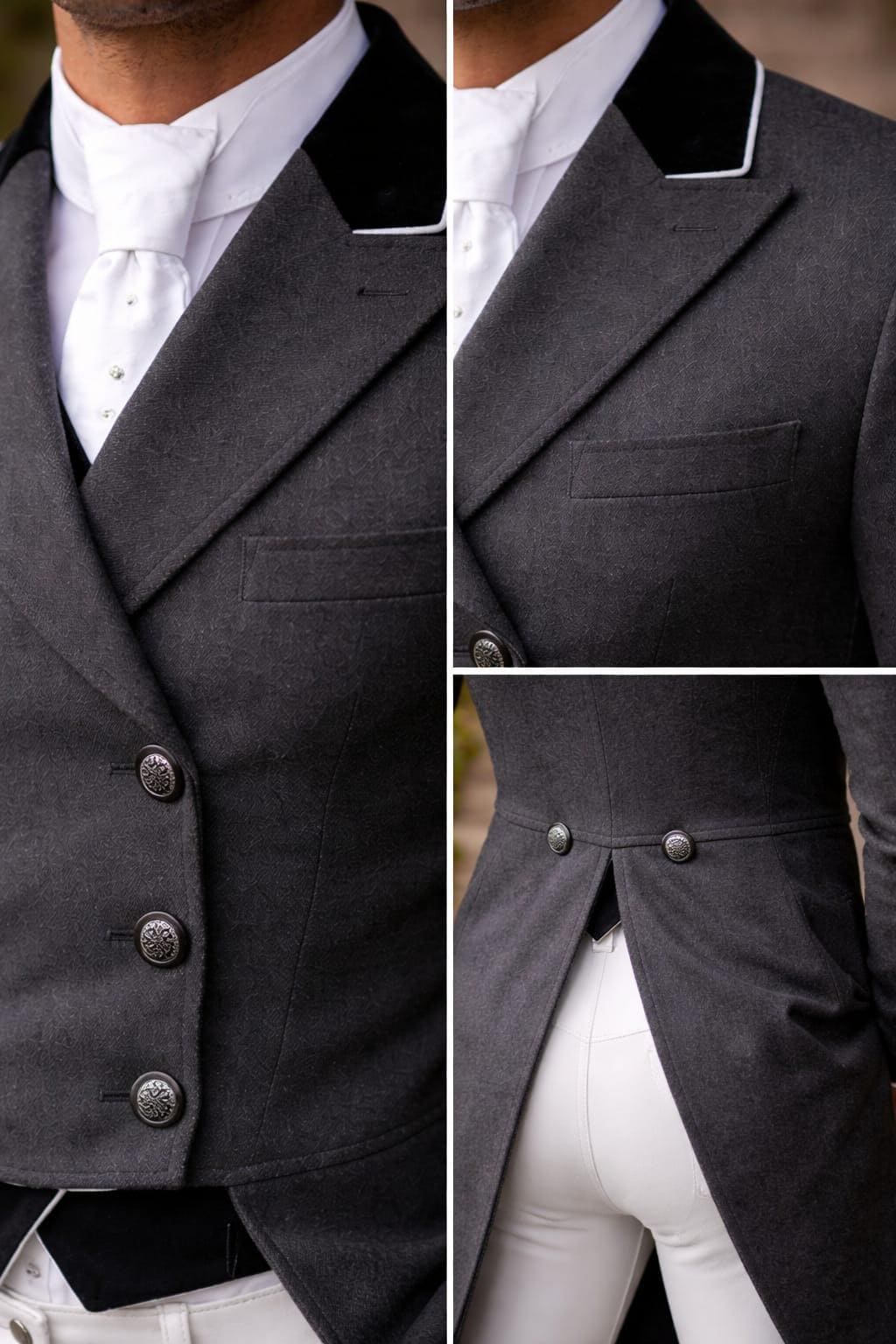 The sleek charcoal tone combined with a contrasting velvet collar and crisp white styling creates a luxury aristocratic look reminiscent of Regency and Victorian fashion. Whether you're a groom, performer, or fashion enthusiast, this coat delivers unmatched style and confidence.