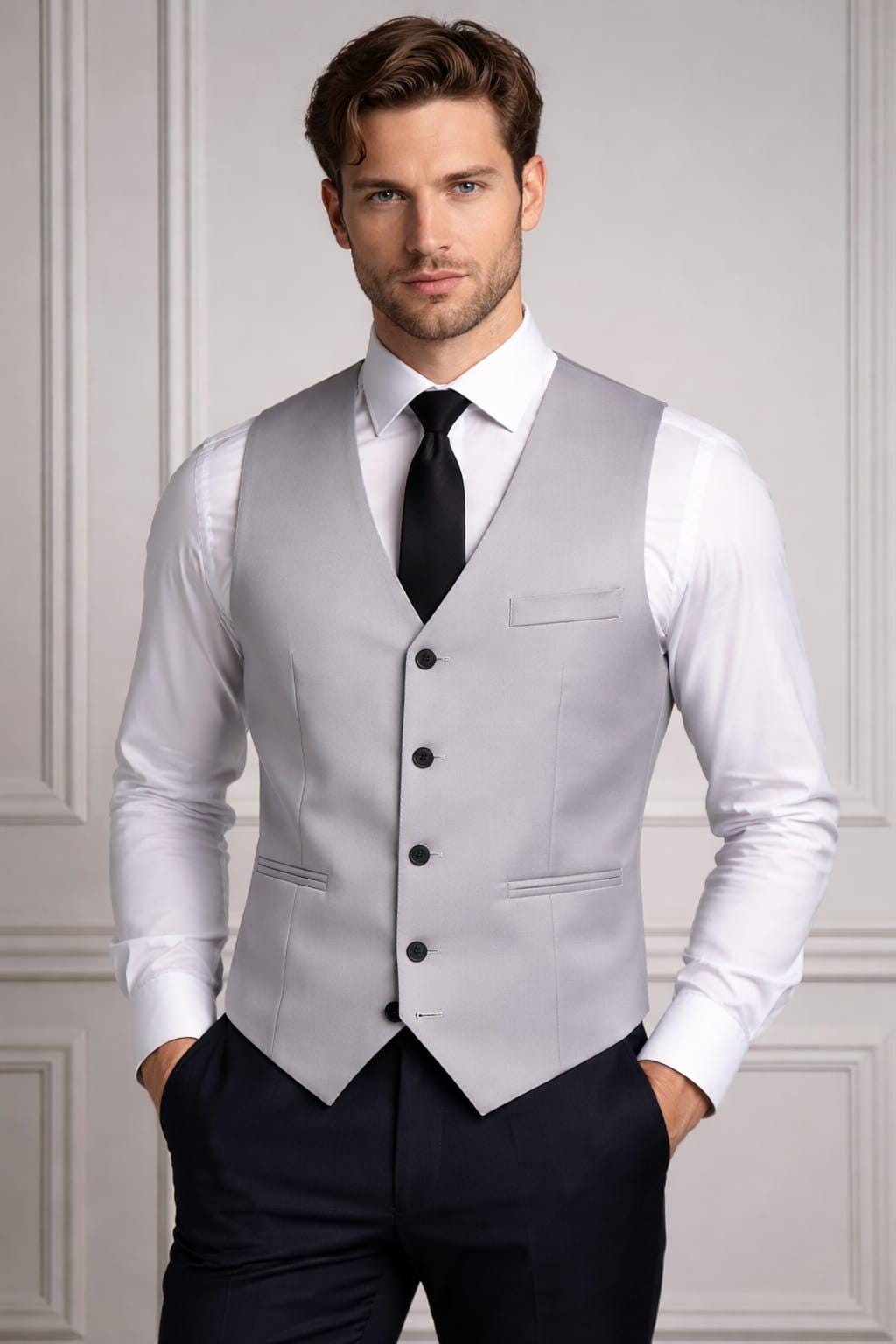 Elevate your formal wardrobe with this sophisticated light grey men’s waistcoat vest, designed for a sharp, modern, and tailored look. Crafted with precision, this slim-fit vest perfectly complements weddings, business attire, and formal events.