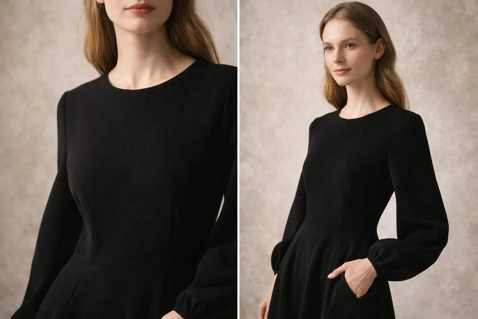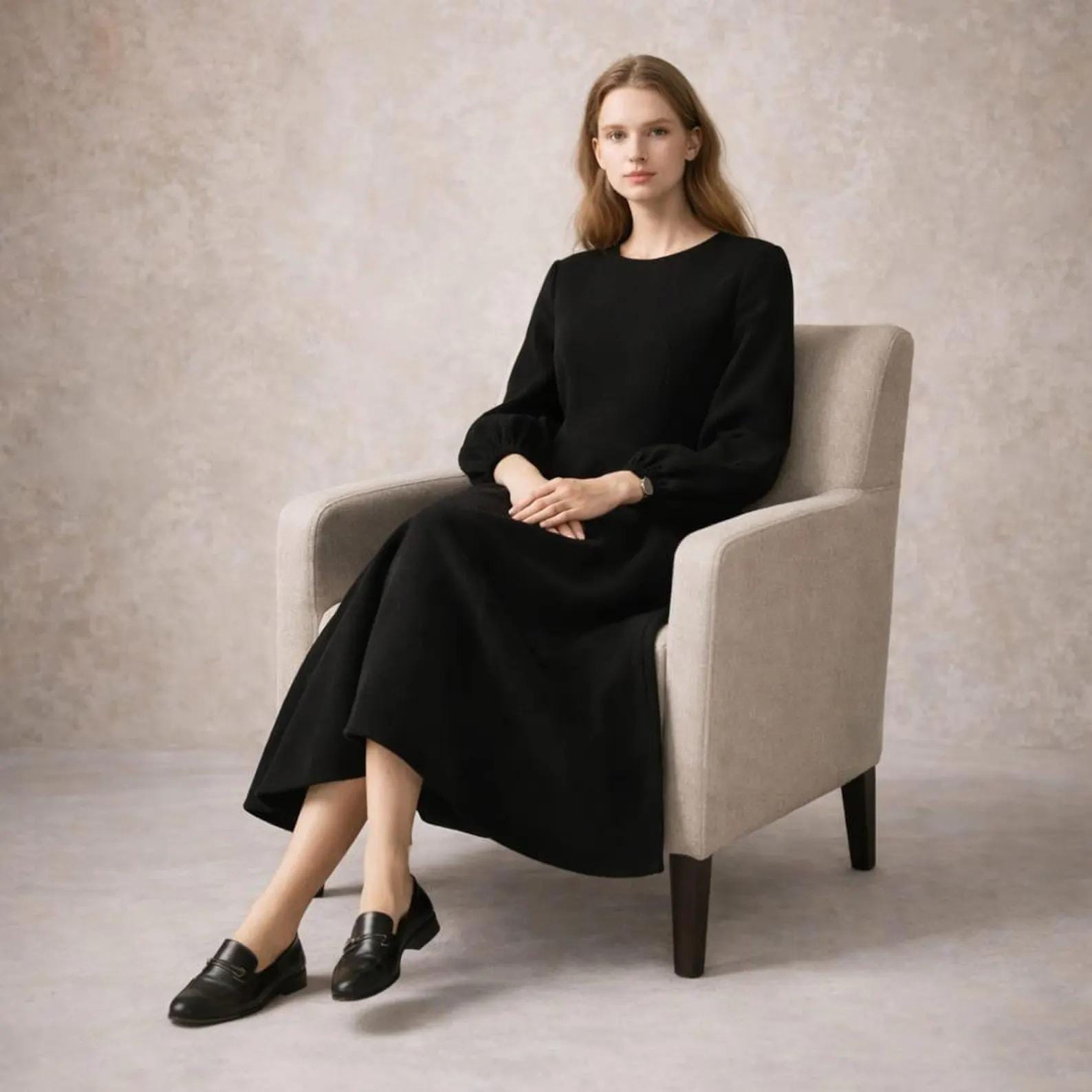 This timeless black dress combines comfort, elegance, and modern minimalism, making it a must-have piece for every wardrobe.